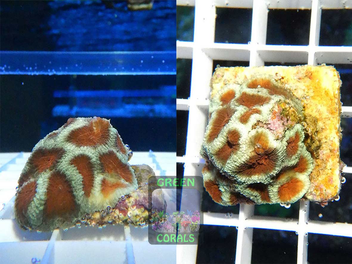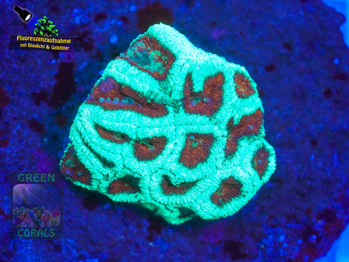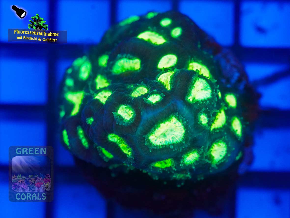 Unsere Farbform der Favites complanata zeichnet sich durch einen sehr schönen Kontrast zwischen braun und grün aus. Besonders unter Blaulicht fluoreszieren die Mundscheiben leuchtend grün.