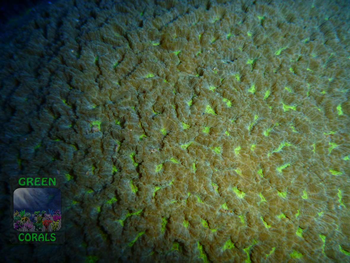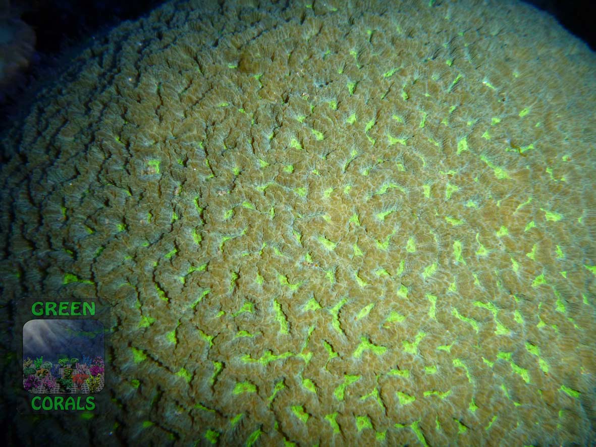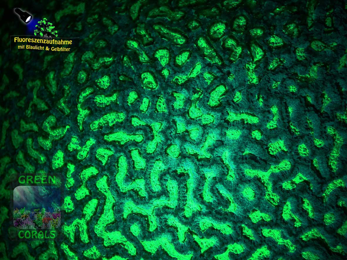 Diese Hirnkoralle Platygyra sp. ist unser ganz spezielles GREEN CORALS Maskottchen – eine Fluoreszenzaufnahme von ihr hat den Hintergrund für unser Logo geliefert.