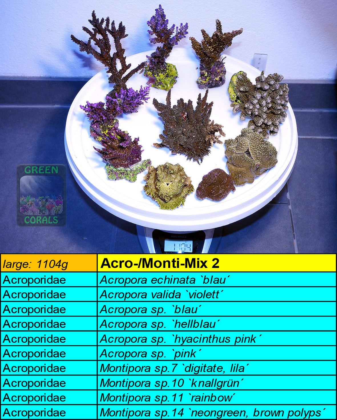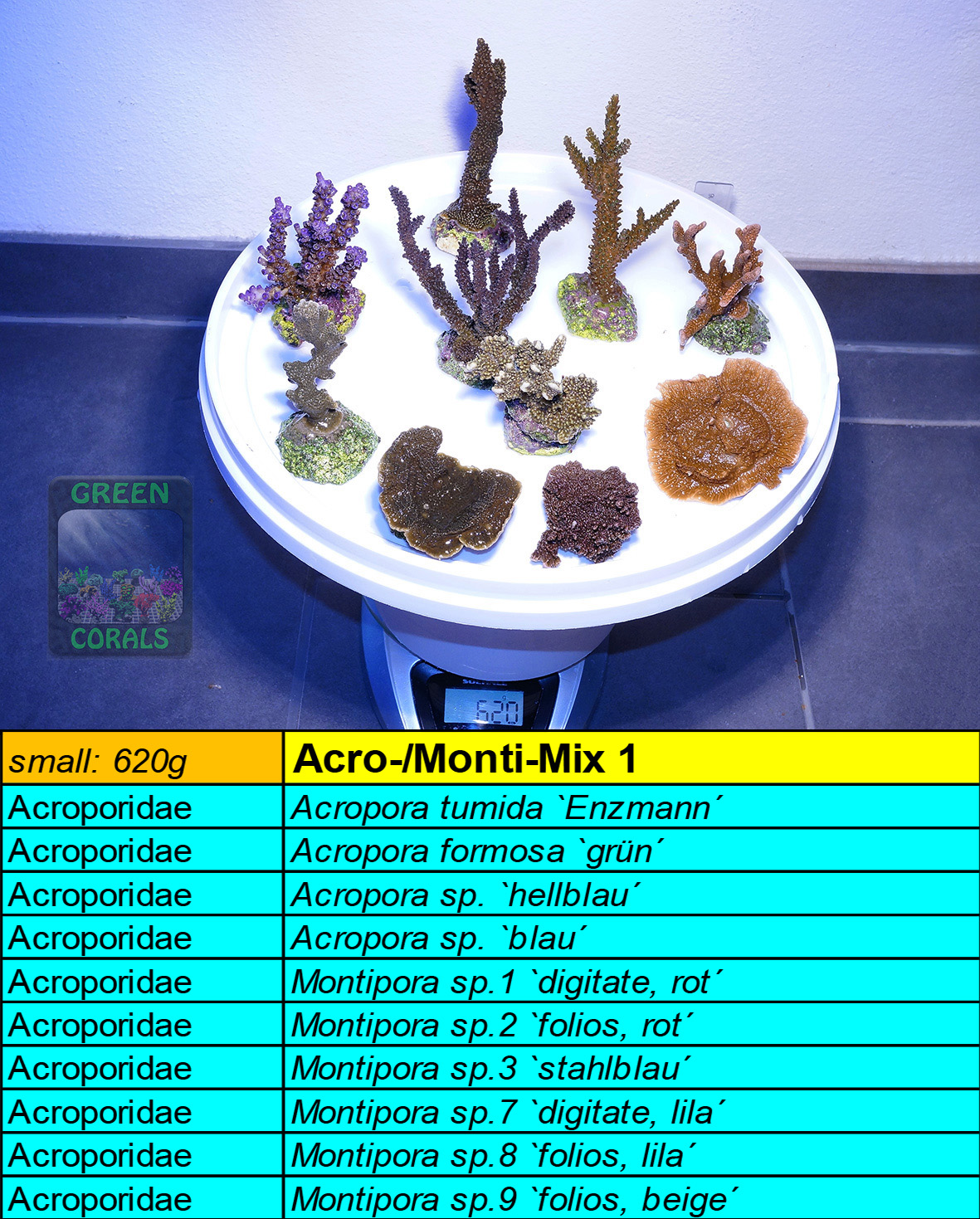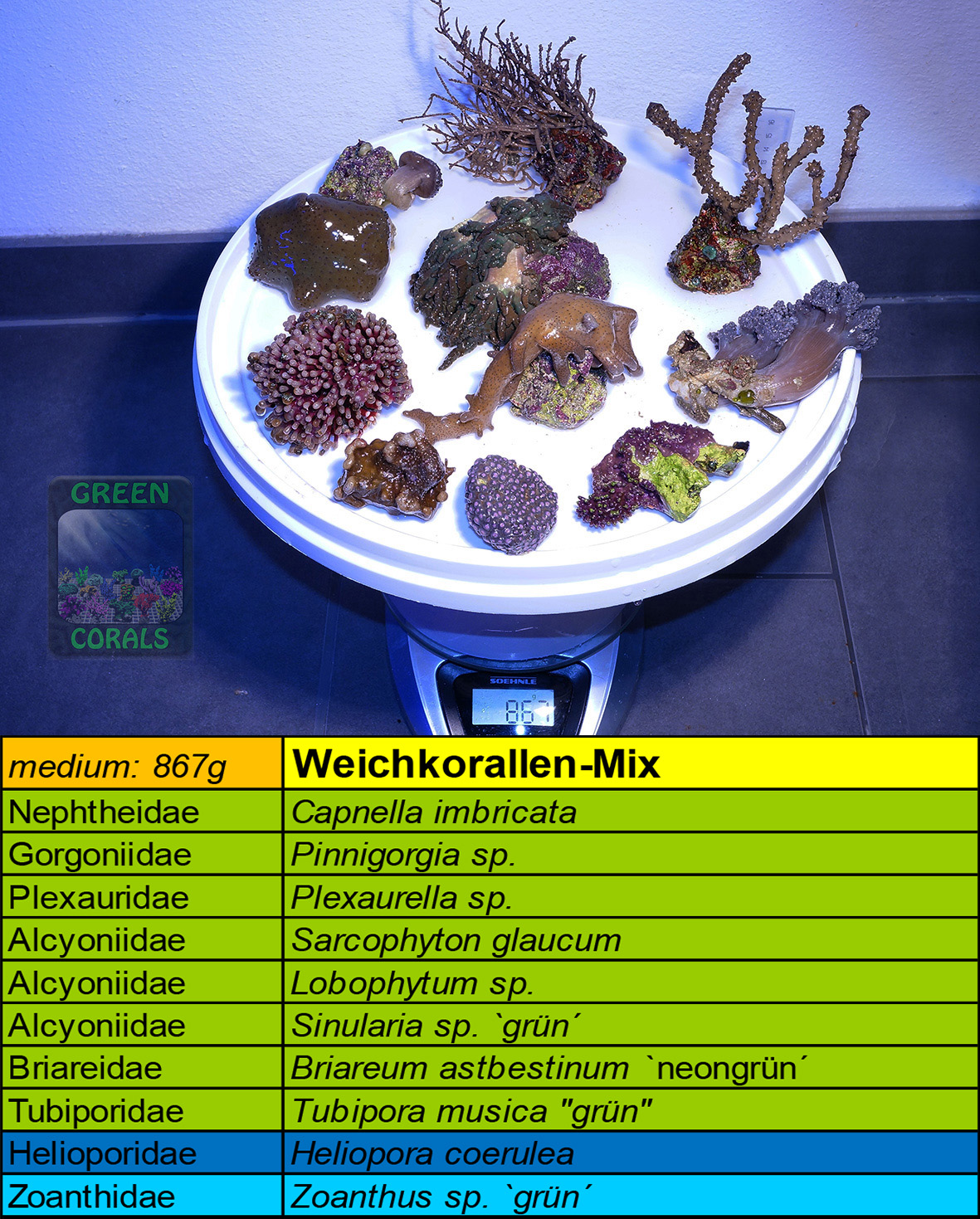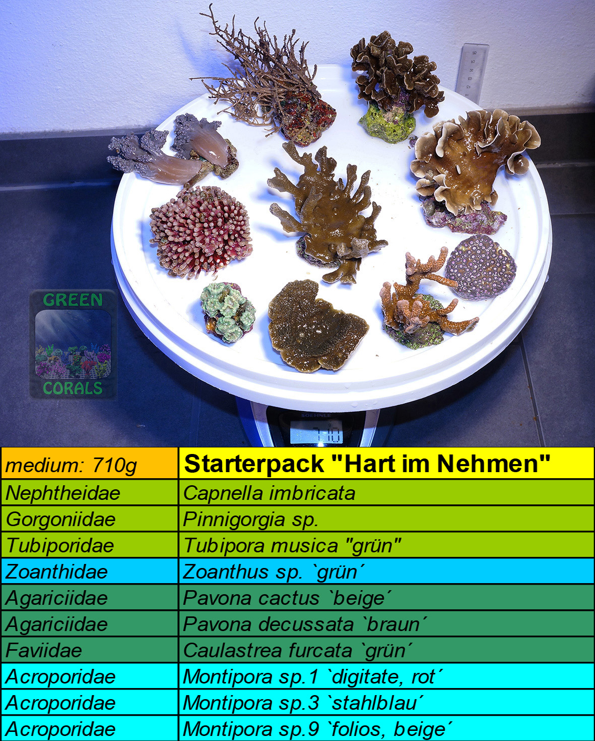 DESCRIPTION: These corals really put up with a lot before they close their polyps: Fluctuating water parameters, high nutrient concentrations and low light are tolerated without a flinch. This pack is ideal for nano tanks, which usually have a higher range of water parameters fluctuation: the tank will be beautifully overgrown in a short time! TIP: Place Capnella, Pinnigorgia, Tubipora and the foliose Montipora at the bottom, e.g. in the corners – they need little light and grow fastest. The Pavona and the two digitate Montipora will of course thrive better in a brighter spot, but will also manage with less light. Montipora sp. is light grey with steel blue polyps in high light and dark beige in low light…