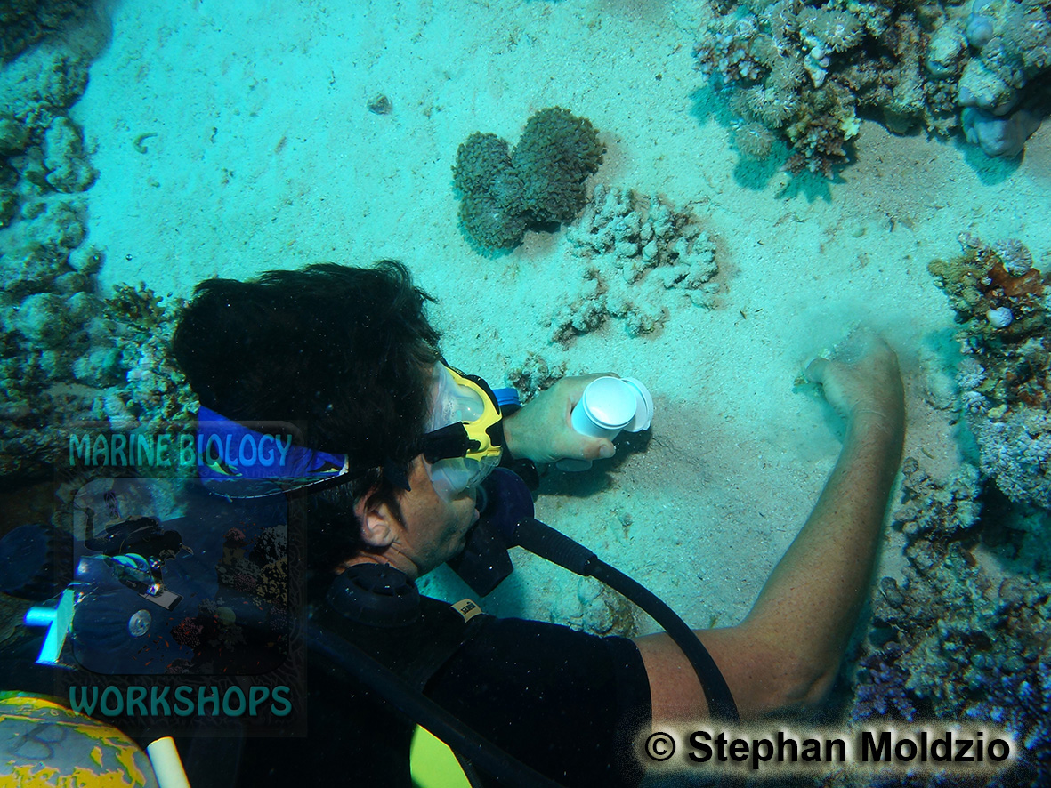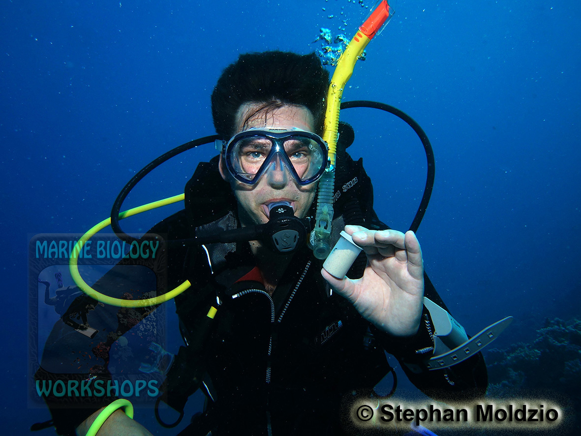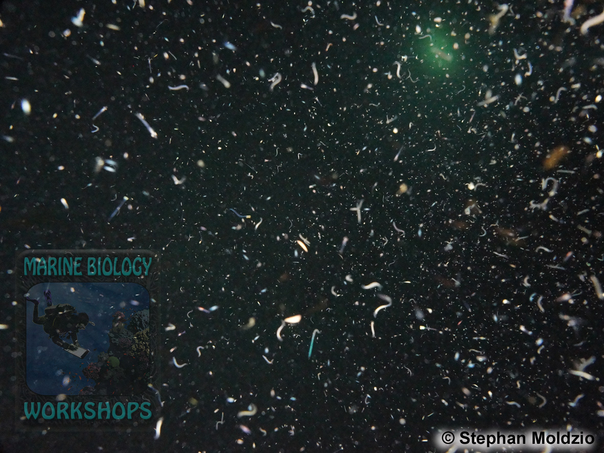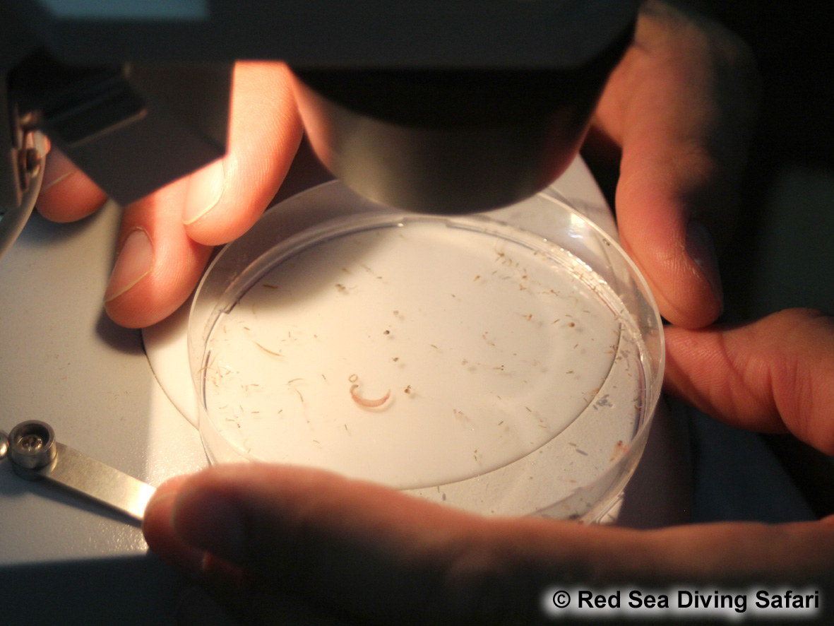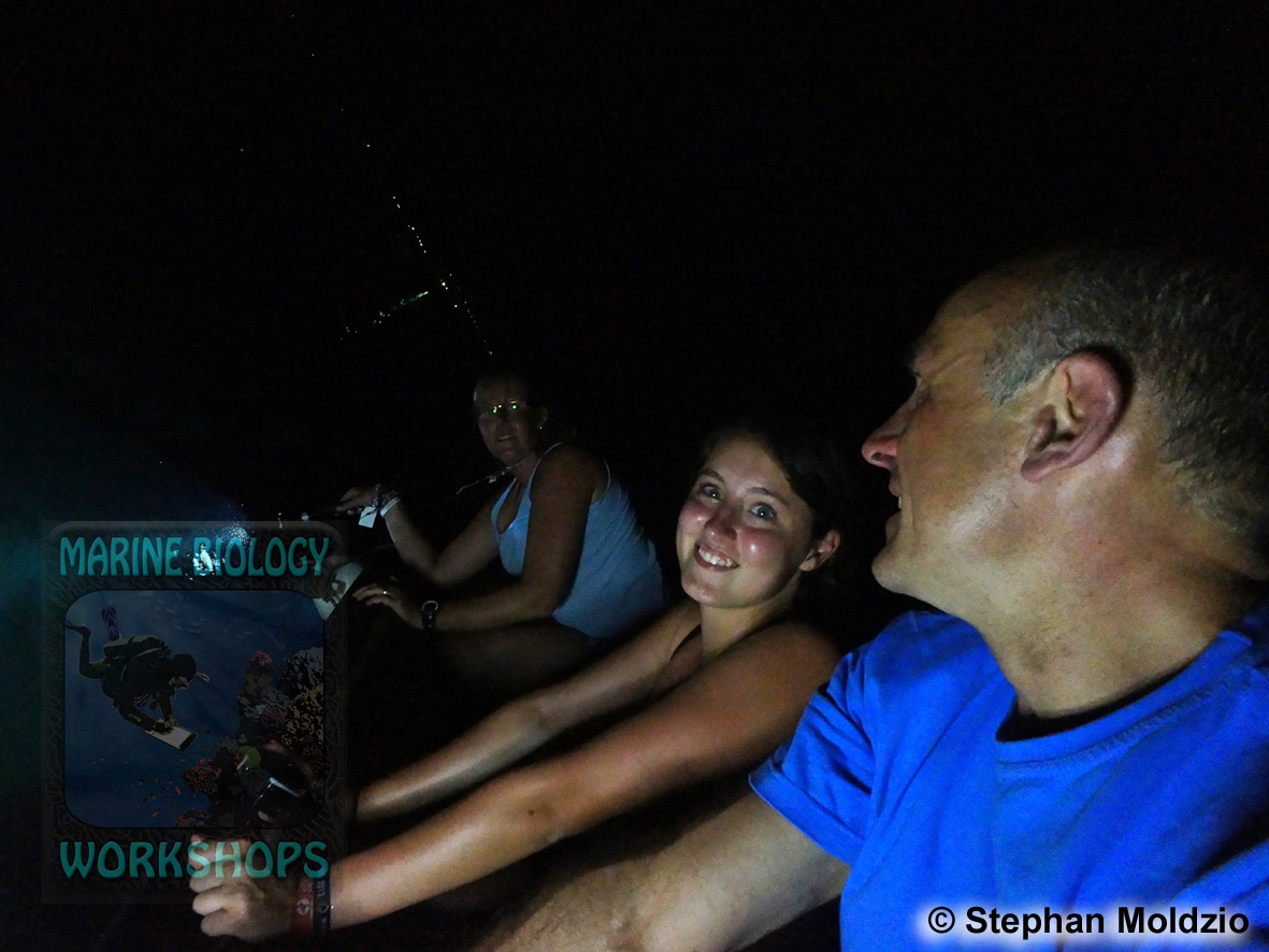 Während eines Nachttauchgangs wurde eine Sand- und eine Korallengeröllprobe genommen. Anschließend trafen wir uns am Bootssteg, um eine Planktonprobe zu ziehen. Es war erstaunlich zu sehen, wie mit der Zeit immer mehr Kleinlebewesen, umherschwirrende Larven und andere Planktonorganismen vom Licht unserer Lampe angezogen wurden.
