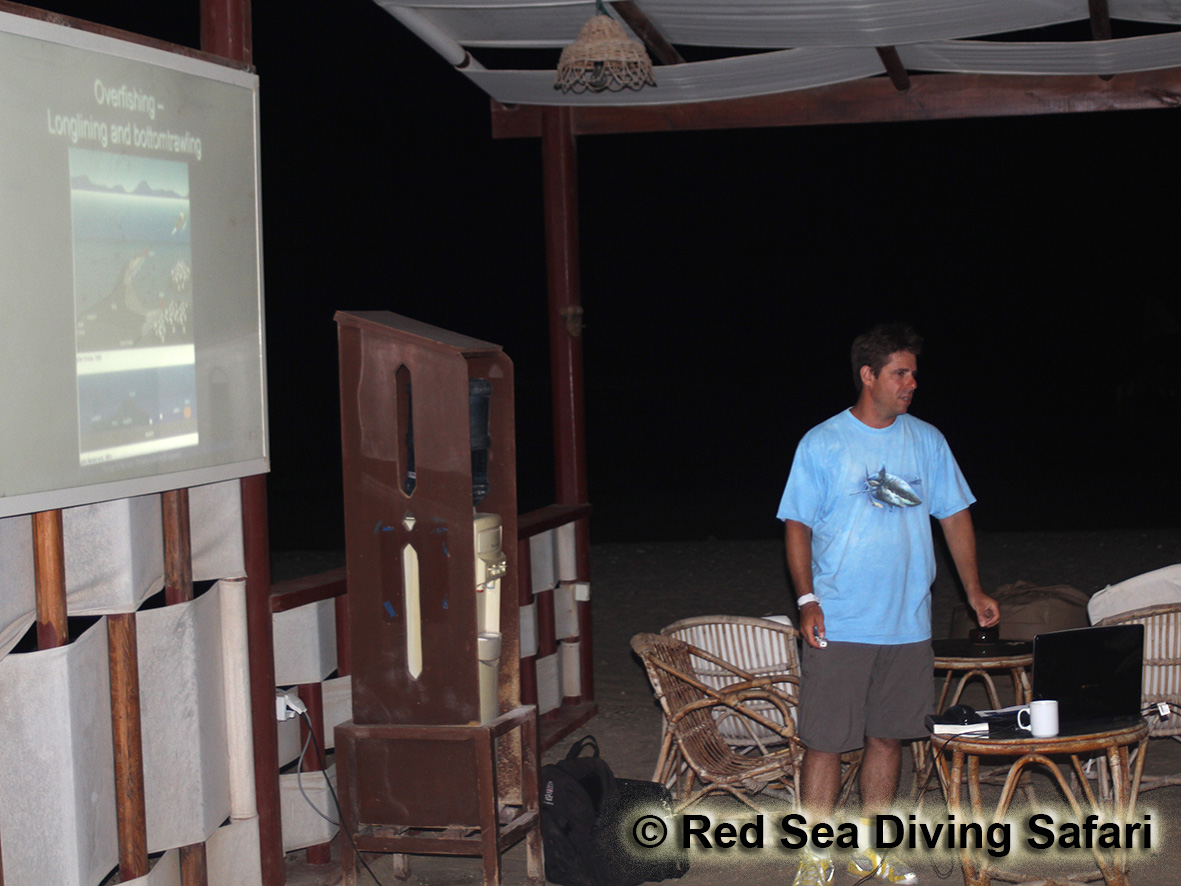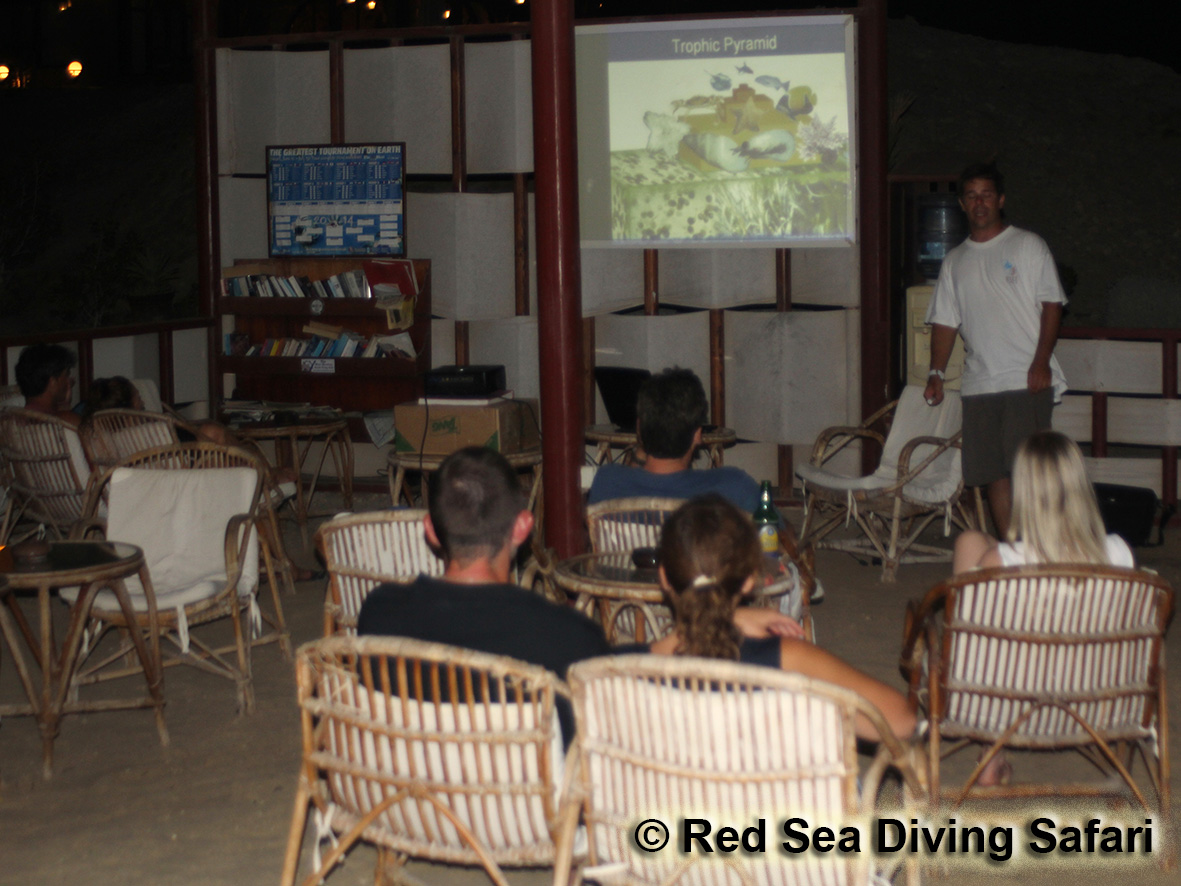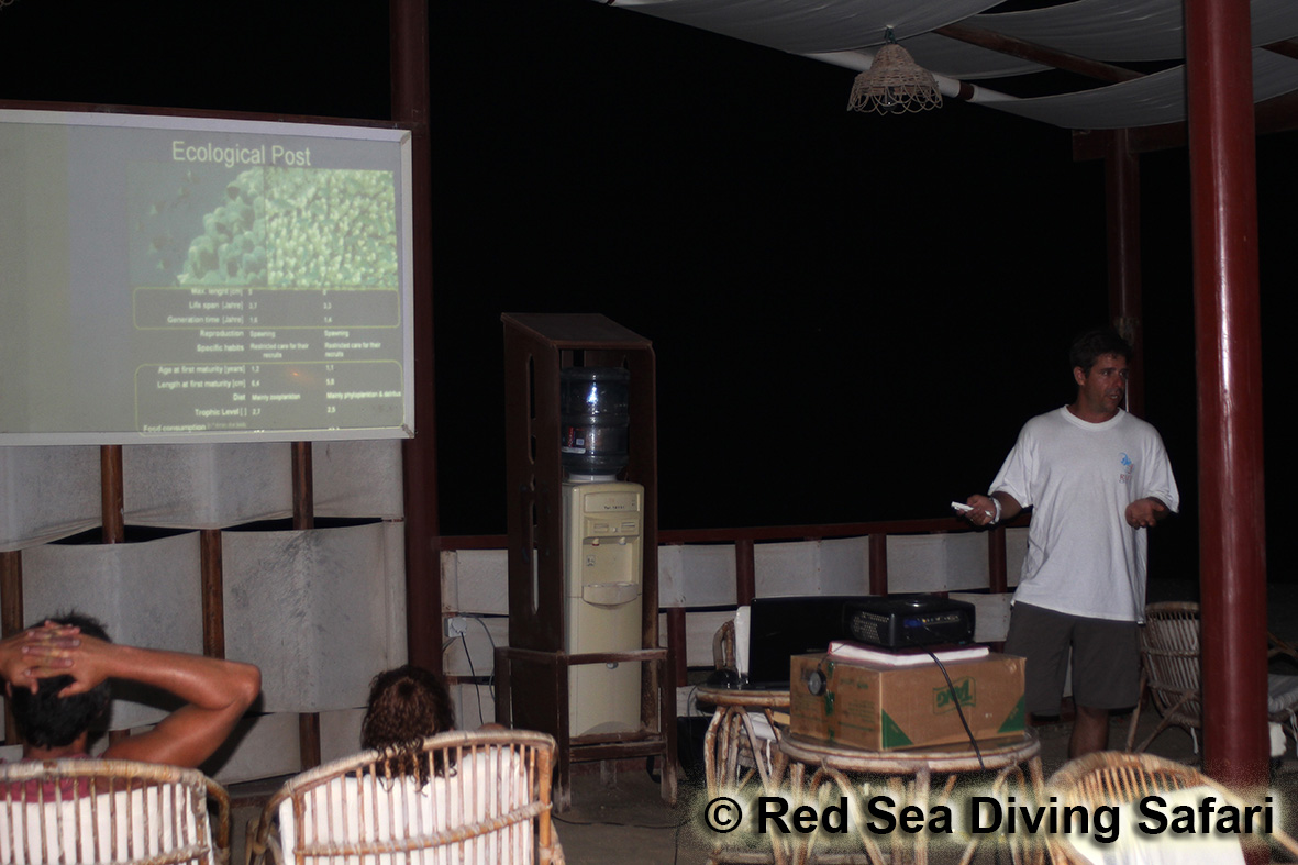 Der Abendvortrag „Coral Reef Ecology“ behandelte die Voraussetzungen für Riffbildung, Rifferosion, verschiedene Rifftypenihre, ihre Zonierung und die Lebensbedingungen im Korallenriff. Es wurde die Frage nach der Entstehung dieser enormen Artenvielfalt im Korallenriff erörtert und ein Blick auf die mannigfaltigen Beziehungen zwischen den verschiedenen Arten und auf das Nahrungsnetz geworfen und zu guter Letzt auf die Korallen, die „Baumeister“ der Riffe.