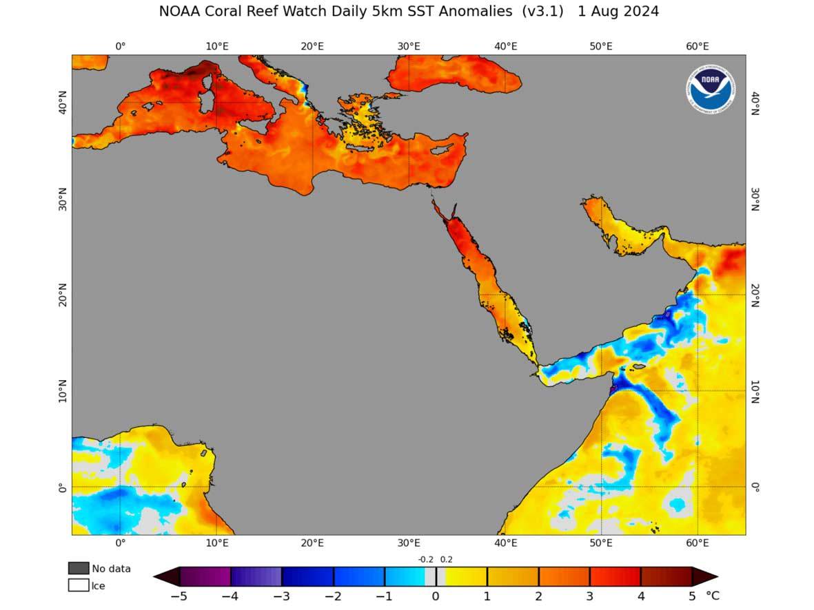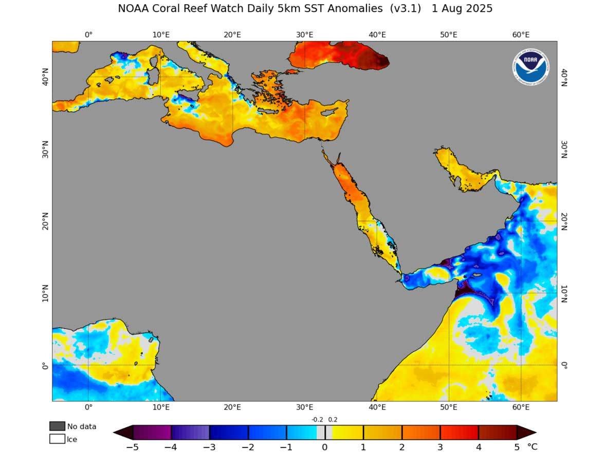 Im Juli war nach den Daten von NOAA Coral Reef Watch noch kaum Hitzestress vorhanden, erst im Laufe des August baute sich dieser allmählich auf.