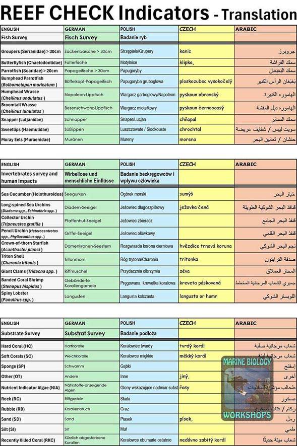 Der Kurs war ausgebucht – 14 Teilnehmer aus fünf Ländern: Deutschland, Polen, Tschechei, England und Ägypten. Die Sprache im Kurs war englisch. Um die Verständigung über die wichtigsten Inhalte zu erleichtern, wurden die Reef Check Indikatororganismen in die jeweiligen Sprachen übersetzt.