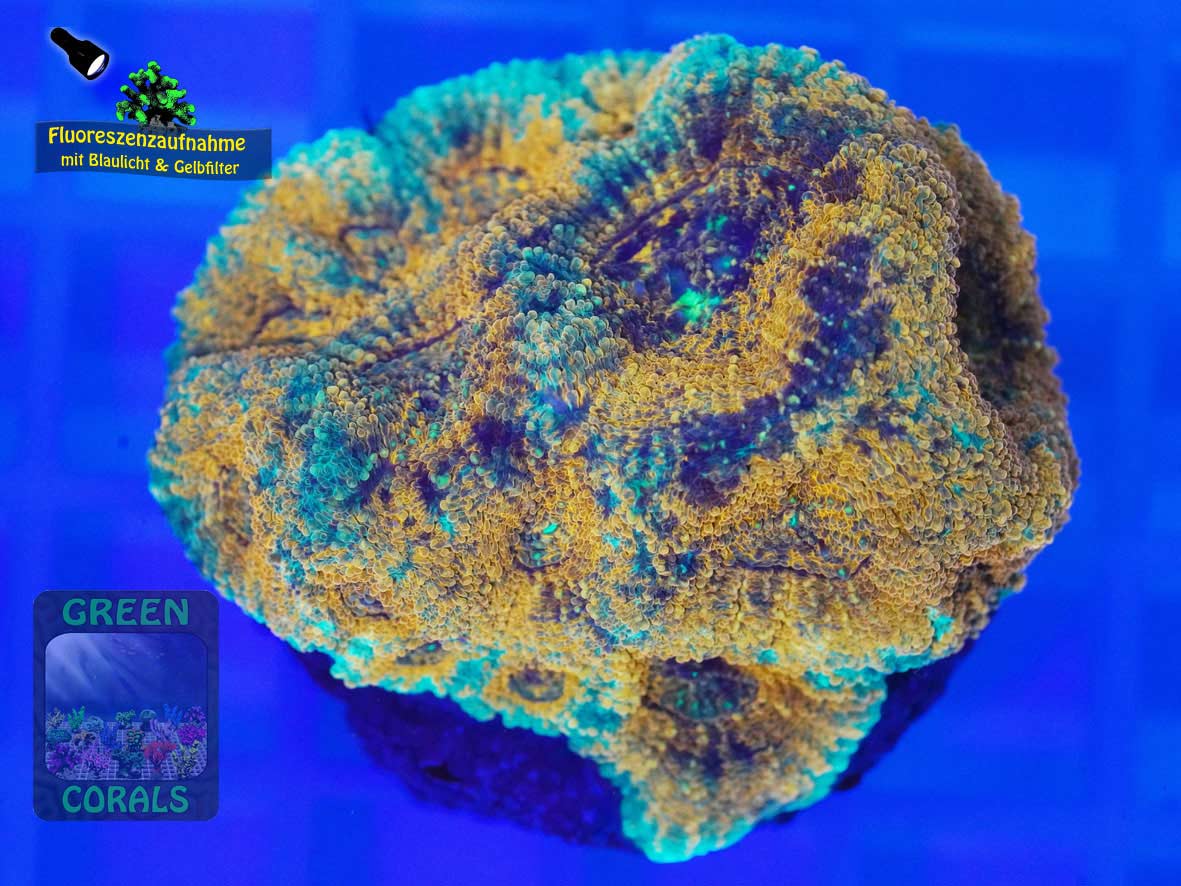 Die attraktive, stark fluoreszierende und massiv bis krustenförmig wachsende Acanthastrea echinata ist schon eine echte Rarität. Im Aquarium benötigt sie moderate Strömung und relativ wenig Licht. Deshalb sollte man sie nicht zu hell, sondern am besten im Bodenbereich platzieren. Hier kommen ihr auch die Schwebeteilchen und das nächtliche Plankton als Nahrung zu Gute. Wenn abends die Polypen geöffnet sind, kann sie gerne zugefüttert werden.