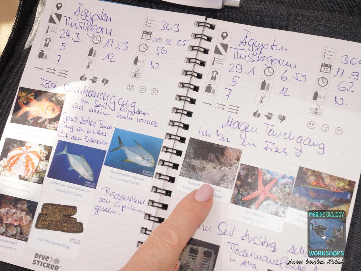 Mit auf der Reise war auch Julia von Dive Sticker. Sie hatte allen Teilnehmern der Reise freundlicherweise ein Sticker-Set „Rotes Meer“ zur Verfügung gestellt. Die Idee von Dive Sticker ist, daß man nach seinem Tauchgang die beobachteten Meerestiere als kleinen Aufkleber in sein Logbuch kleben kann. So ist man herausgefordert, sich noch intensiver mit der Artbestimmung beschäftigen und hat obendrein auch noch ein schönes Logbuch.