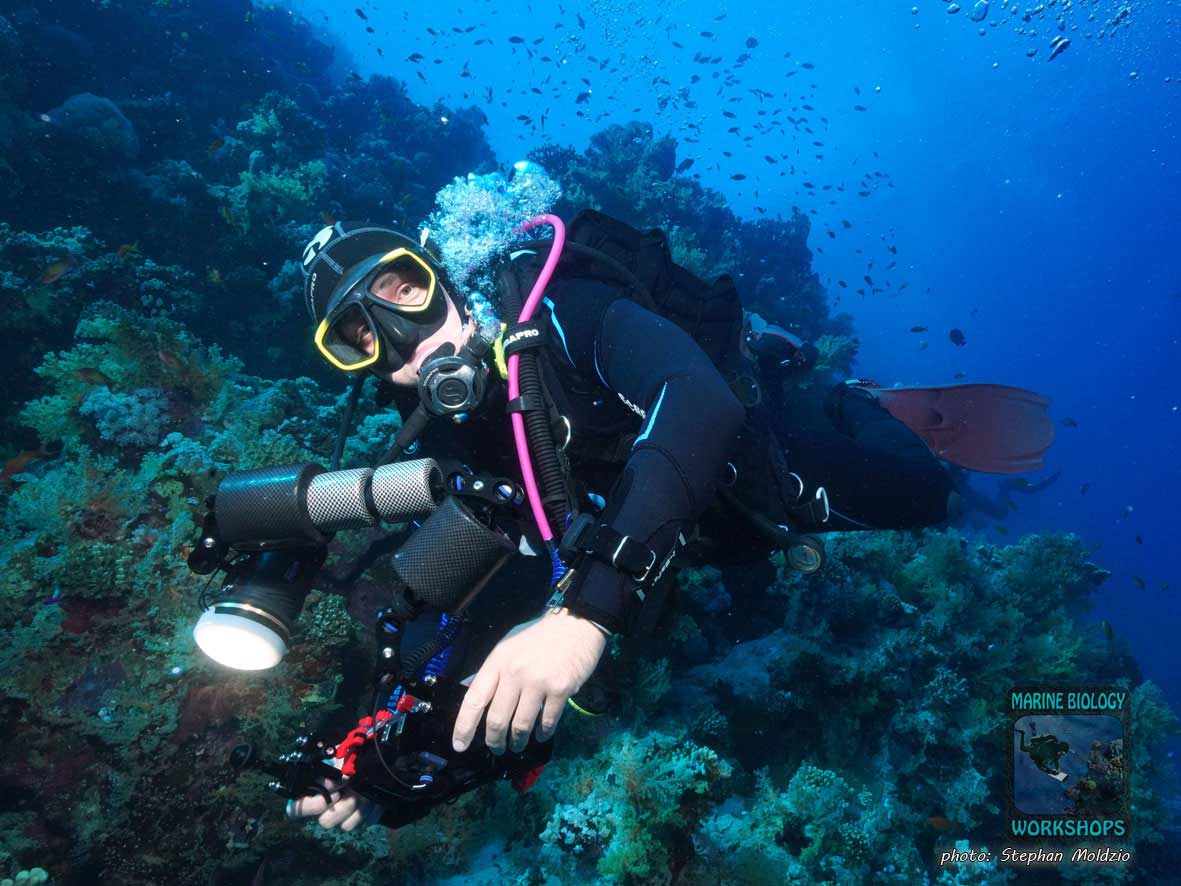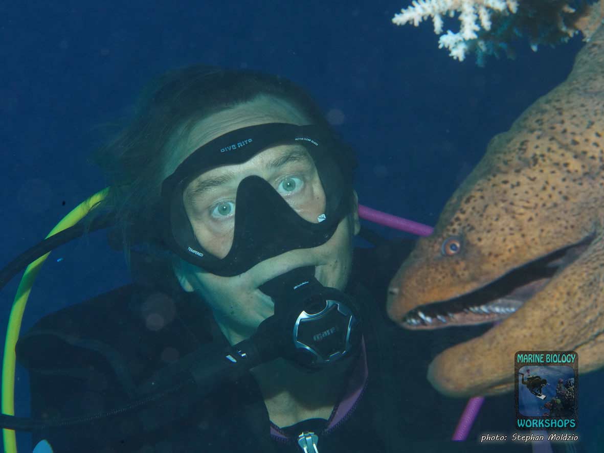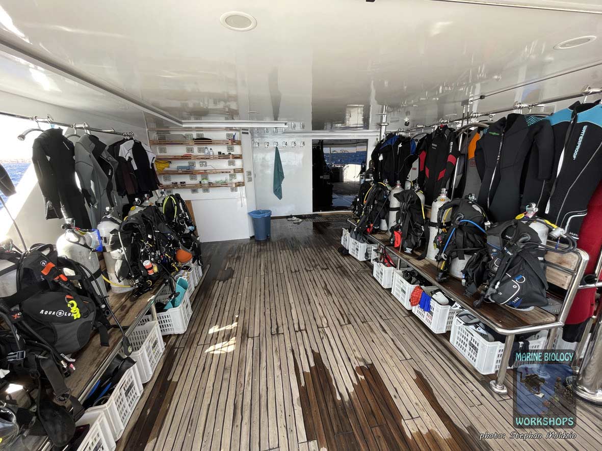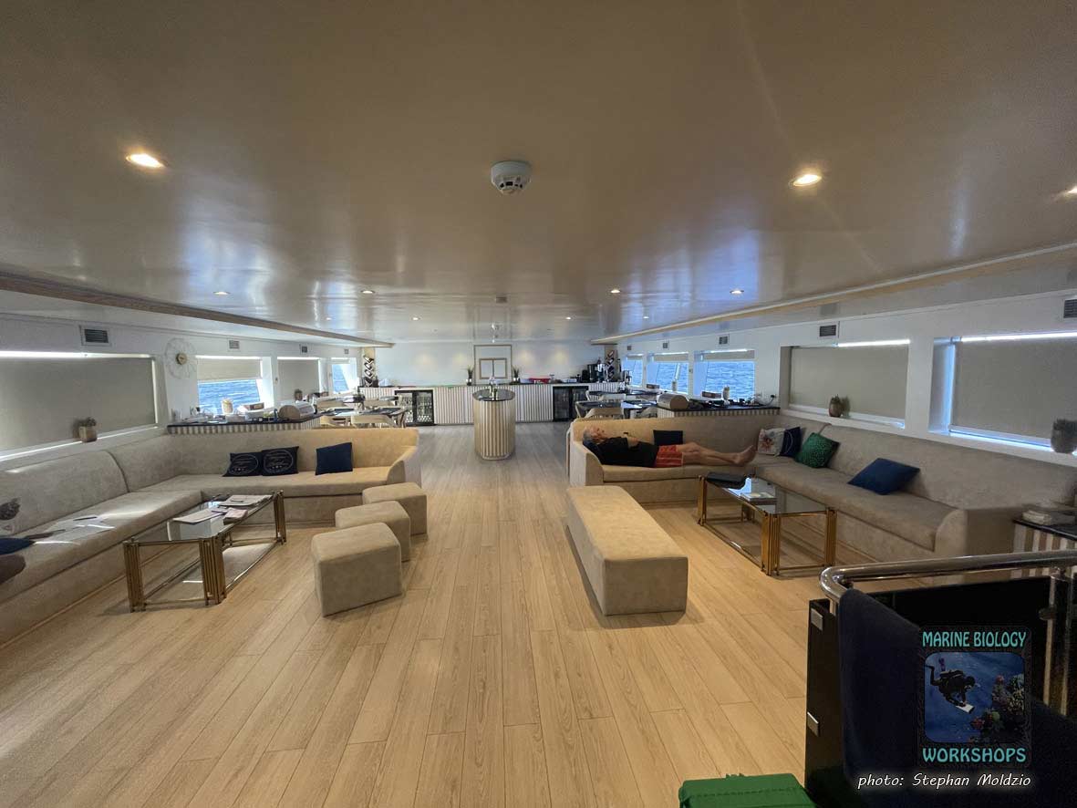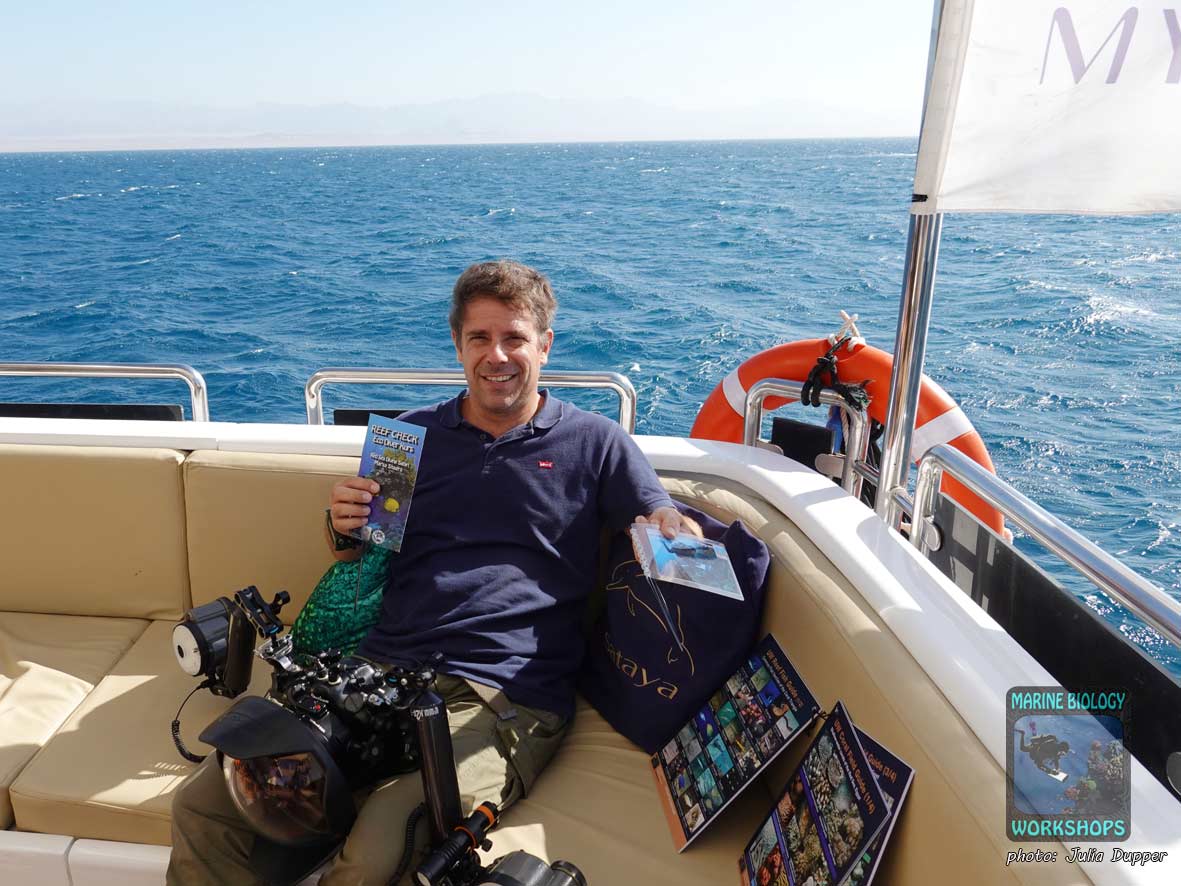 Zu Beginn der Reise stellte der Meeresbiologe Stephan Moldzio das geplante Programm der Gruppe vor. Neben den abendlichen Vorträgen stand er den Teilnehmern jederzeit für Fragen zur Verfügung – ob beim Frühstück, Mittag- oder Abendessen, oder zwischen den Tauchgängen im Salon. Die Gäste durften und sollten ihm ausdrücklich „Löcher in den Bauch“ fragen zu den verschiedensten Themen, wie Fische, Wirbellose und Korallen, Korallenriffökologie, zu interessanten Zusammenhängen und Interaktionen, zum Phänomen des Korallenbleichens und dem Zustand der weltweiten Korallenriffe, oder auch Tips zur UW-Fotografie.