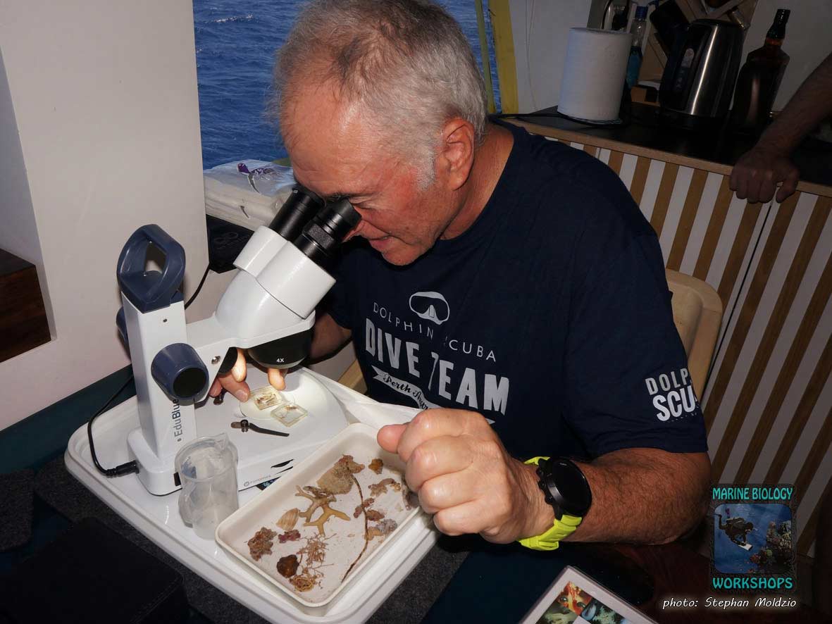 Ein erstes Highlight war die Mikroskopie-Session am zweiten Tag: Während des Tauchgangs an dem Wrack der „Dun Raven“ nahm Stephan Sand- und Korallenbruchproben und bereitete diese für die Untersuchung am Nachmittag vor. In kleinen Gruppen konnten die Gäste selbst Mikroskopieren und Fragen stellen zum faszinierenden Mikrokosmos im Korallenriff: